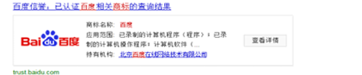 觸發(fā)機制:無論搜索任何關(guān)鍵詞,只要通過商標(biāo)認(rèn)證的網(wǎng)址,被檢索出現(xiàn)在百度搜索結(jié)果中,都會展現(xiàn)藍色?標(biāo)。