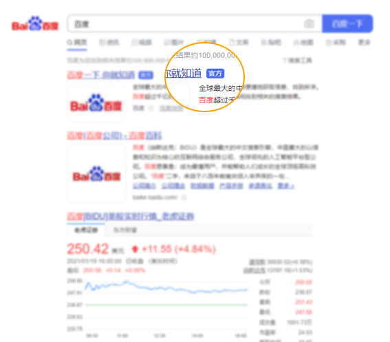 高級版觸發(fā)詞審核通過并生效后,當(dāng)網(wǎng)民精確搜索該觸發(fā)詞時,若認(rèn)證通過的精確網(wǎng)址出現(xiàn)在搜索結(jié)果中,將為其展現(xiàn)藍色“官方”標(biāo)識。