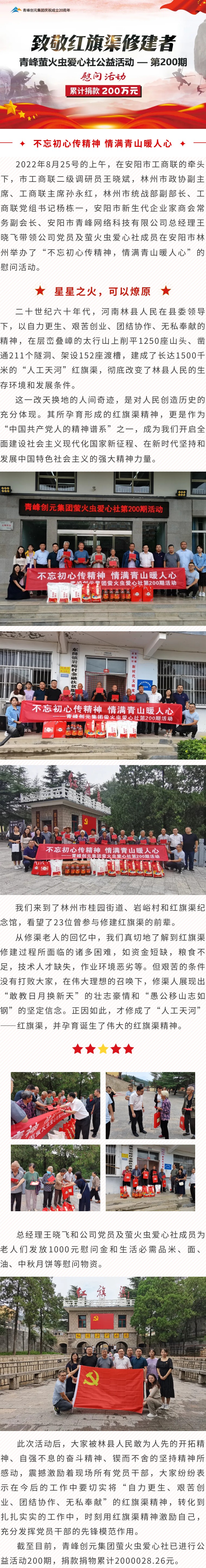 致敬紅旗渠修建者-青峰創(chuàng)元集團(tuán)螢火蟲愛心活動第200期(累計(jì)捐款200萬元)